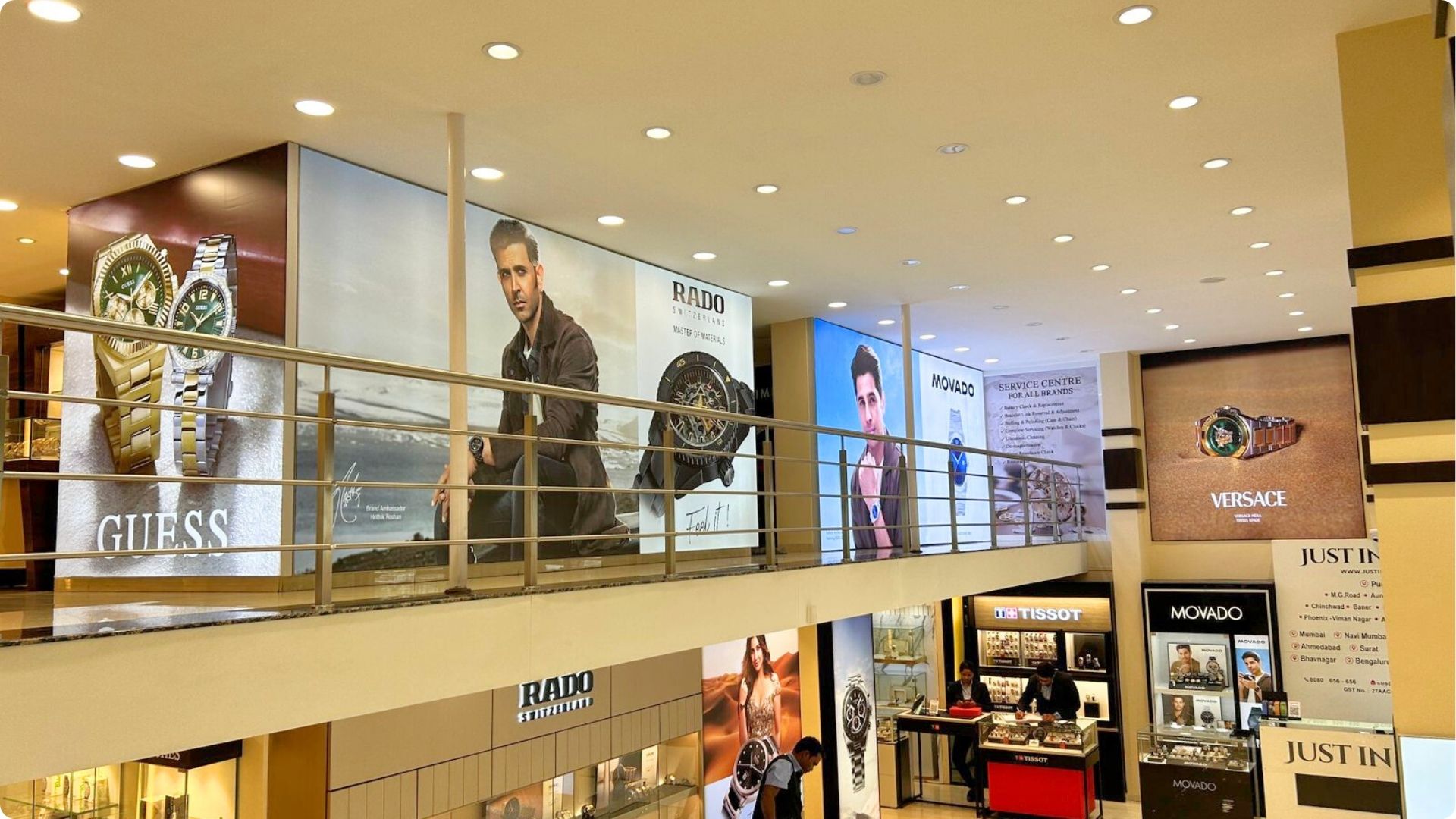 We executed premium in-store branding for Movado at Just In Time, creating a refined visual identity that enhanced product visibility and elevated the luxury experience for walk-in customers.